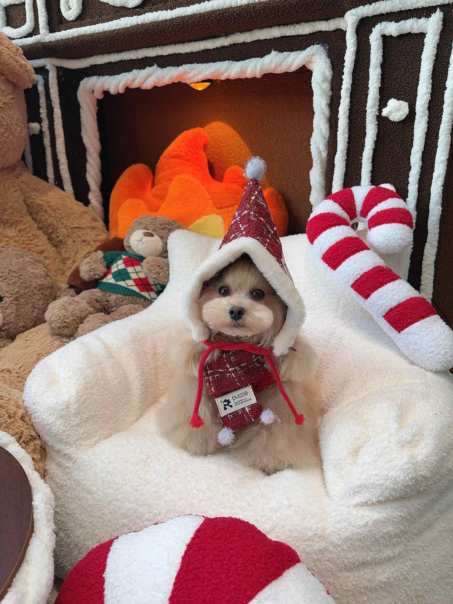 Inspired by classic winter holiday outfits, this set blends festive textures with playful pom-pom details to create a timeless Christmas look for pets.